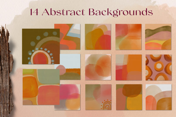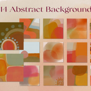 - 14 Abstract Backgrounds in JPEG format (approx 8″ x 8″ – 300dpi)