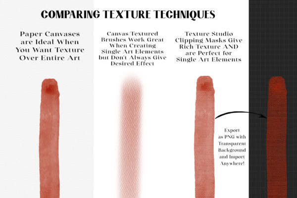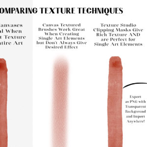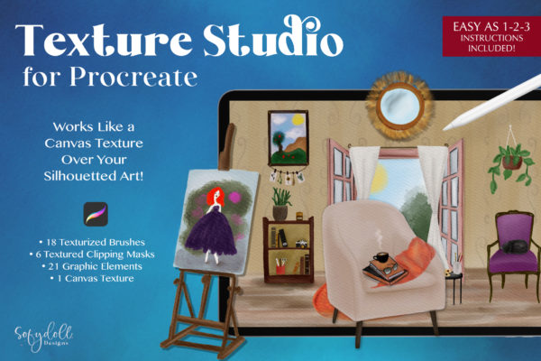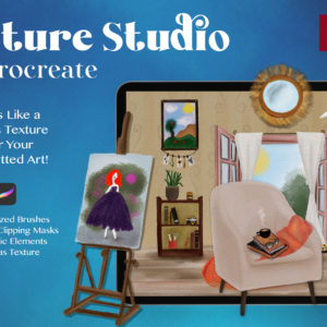 Texture Studio comes with 6 Clipping Mask textures that allow you do instantly add rich texture; from canvas to grainy. Also included are 18 texturized brushes, 21 PNG elements (to create your own scenes) and a bonus paper canvas. Texture Studio makes it easy for both the experienced artist AND the Procreate beginner. Give it a try for yourself!