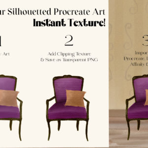 Texture Studio was created because I wanted an easier way to add textures to my silhouetted art. Canvas Textures work great but only when using over entire artwork. Canvas texture brushes don’t always give the desired effect, so I created this toolkit to help make adding texture quicker. It’s also perfect for the Procreate beginner!