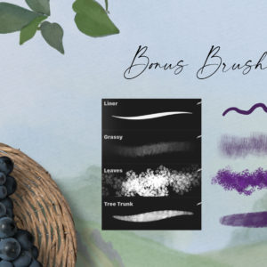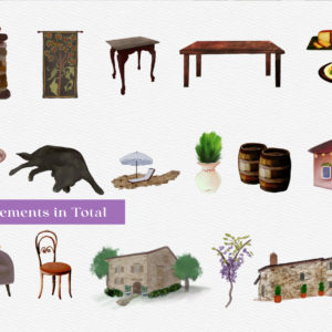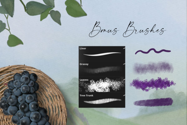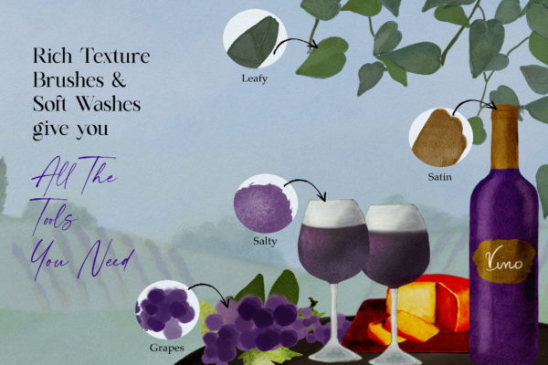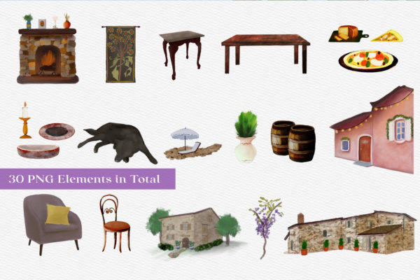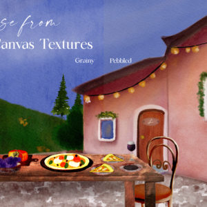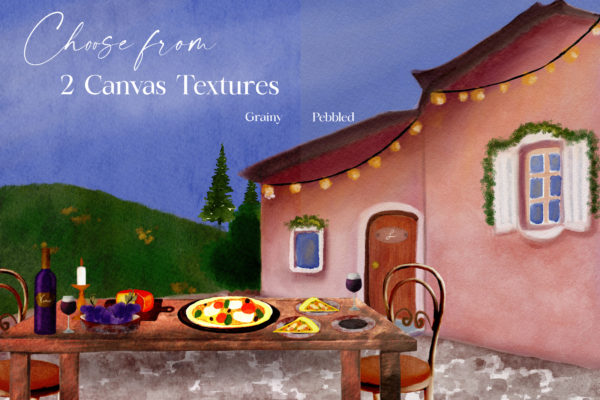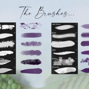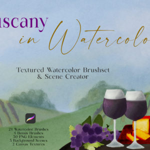 This set does not only consist of uniquely handcrafted brushes and canvas textures, it also includes a scene generator – three Tuscany inspired background scenes and 30 PNG elements you can mix and match with your own artwork! This set is jam packed with Tuscan goodness…details below: